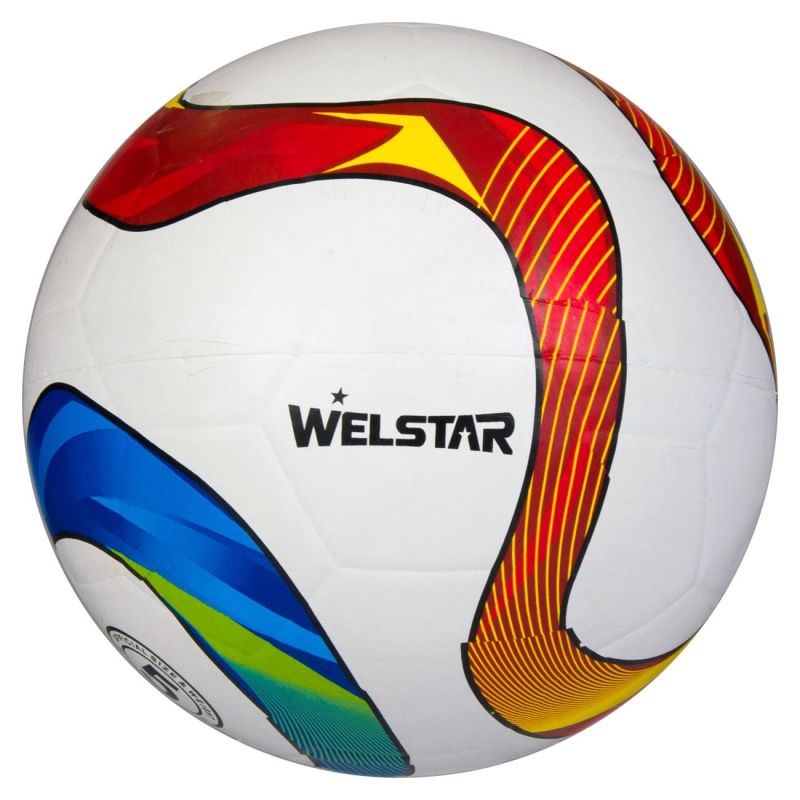 Класическа футболна топка с нормални размери за мач, изработена от трайни материали с висока устойчивост в бял цвят с многоцветни ивици.